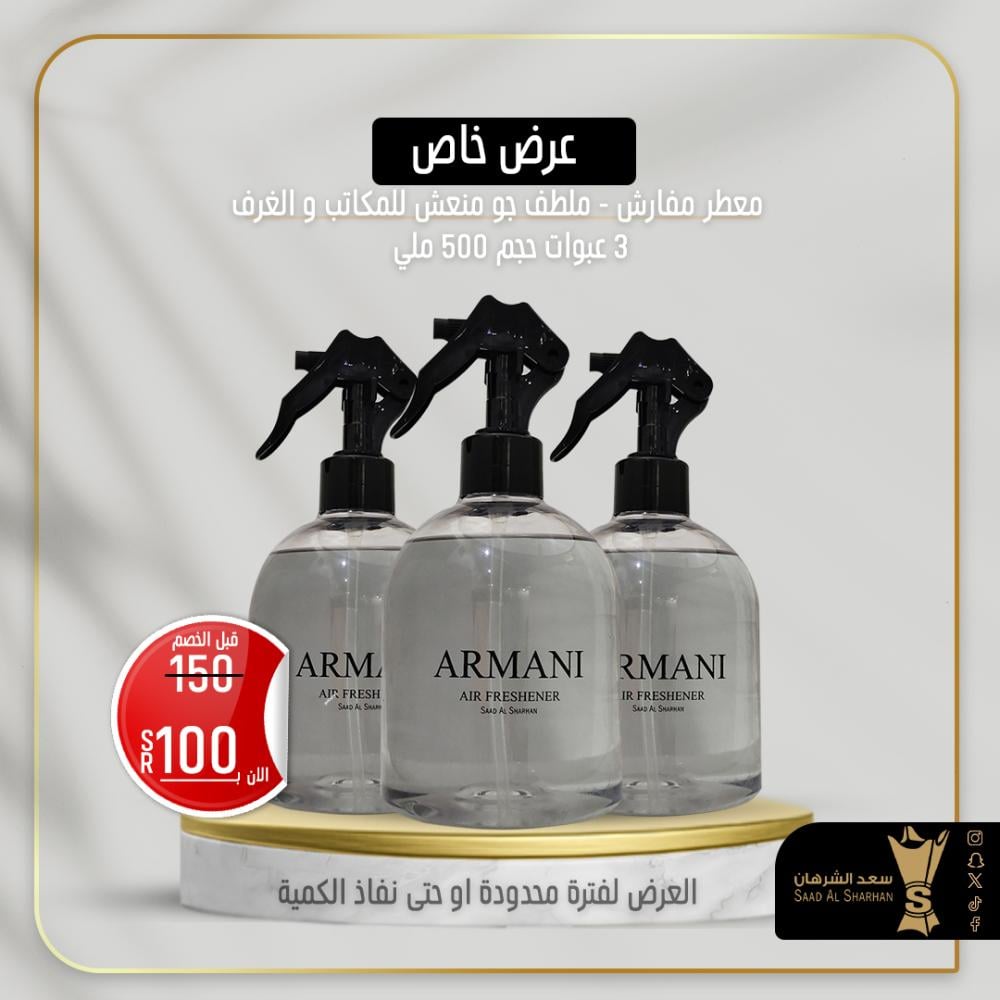 عرض معطر وملطف جو - ارمانيحجم العبوة 500 ملالعرض 3 ب 100 ريالرذاذ جميل منعش وهادي ومناسب للمكاتب والمجالس .